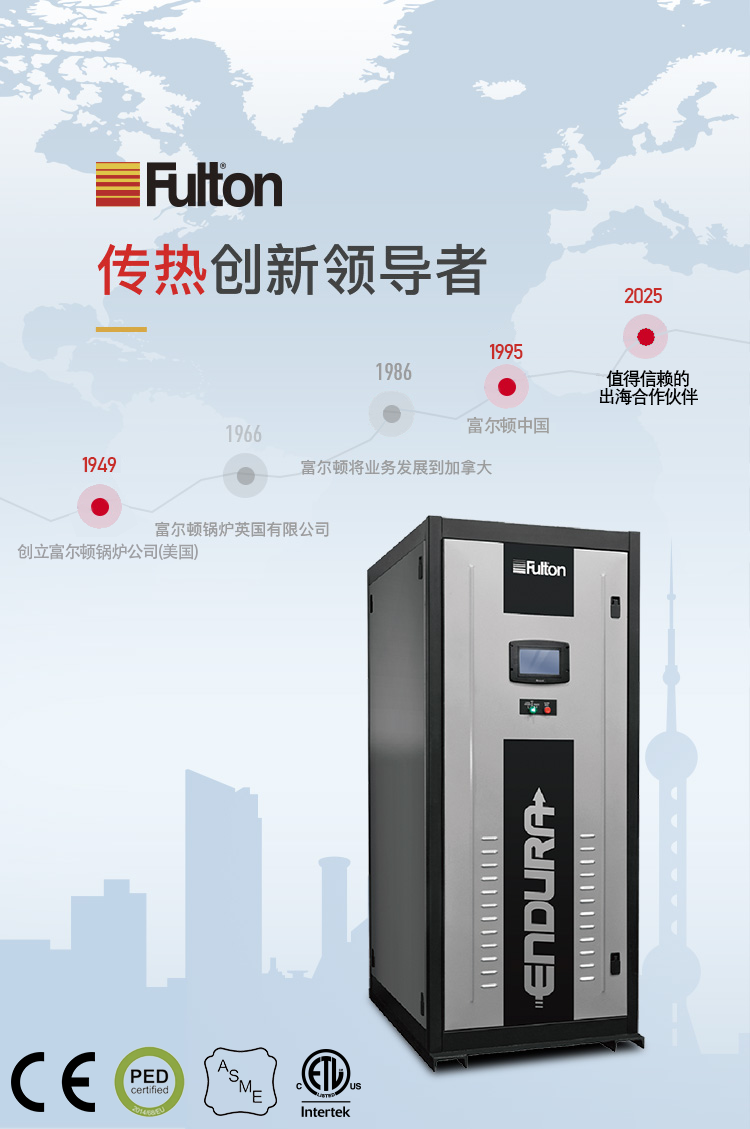 富爾頓是國際著名的跨國高質量傳熱產品制造商,具有七十多年的專業設計、制造、銷售鍋爐的經驗,是立式無管鍋爐和脈沖燃燒鍋爐的發明者,幾十年來一直領導世界鍋爐新潮流。